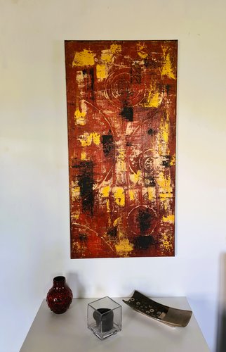 Dieses abstrakte Bild mit Strukturen wurde mit Ölfarben hergestellt in verschiedenen Rottönen, gold und schwarz. umfasst 100 cm x 50 cm.
